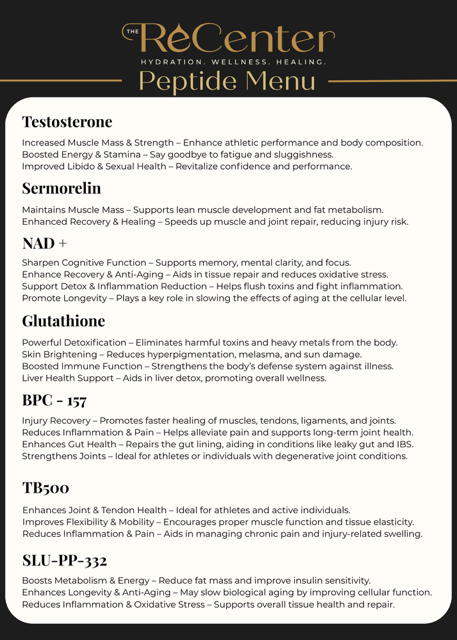 Tired of feeling and looking tired? Or perhaps you’ve just not been feeling as good as you know you can. That’s where peptides and neutraceuticals come in! At The ReCenter, our team has helped thousands of patients look and feel their best with these unique, customized aesthetic and wellness treatments.